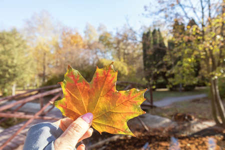 Hand holding yellow and red maple leaf on autumn sunny blurred bokeh background