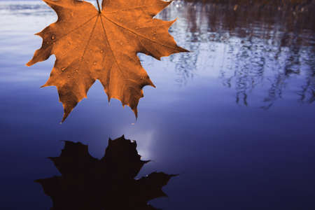 Maple leaf with reflection on water surface. Autumn season concept.