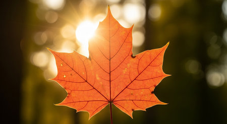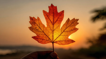 A captivating autumn scene showcasing a vibrant leaf illuminated by golden sunset rays. The serene forest background enhances the natural beauty of the moment.
