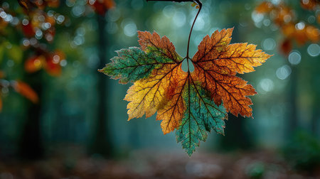 Bright orange and yellow leaves hang from a delicate branch capturing the essence of autumn in a peaceful forest. The warm light enhances the beauty of the changing foliage.