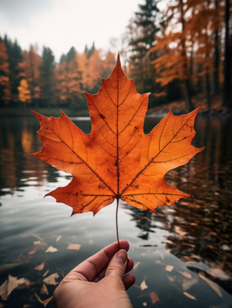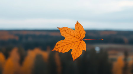 A striking orange maple leaf floats gracefully in the foreground, enhancing the serene autumn atmosphere filled with soft, blurred colors of nature.