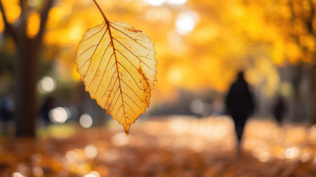 Close-up of a golden-yellow leaf in autumn, with a background of orange trees and bright bokeh, capturing the essence of a sunny day in the park.