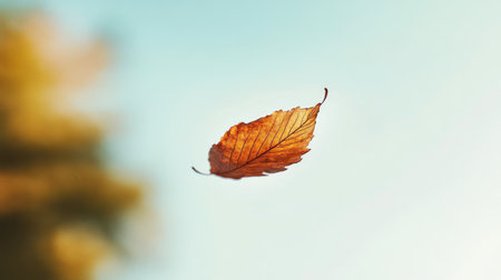 A solitary autumn leaf drifts gently through a serene blue sky, set against a warm backdrop. This image captures a moment of natural beauty and tranquility.
