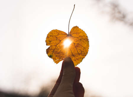 Yellow dry leaf in hand with sun shining through it