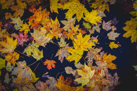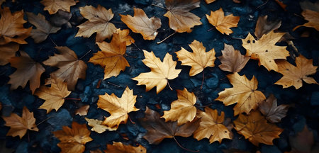 Golden autumn leaves scattered on dark ground. A beautiful display of fall colors.
