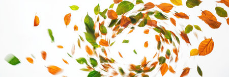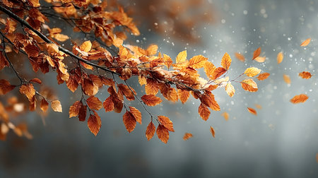 Golden leaves twirling in the autumn breeze. Peaceful nature scene.
