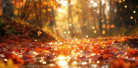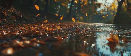 Falling leaves illuminate a forest path. Golden light bathes the scene, creating a serene and magical atmosphere.