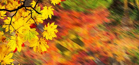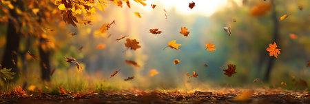 Autumn forest with falling leaves, panoramic banner with copy space