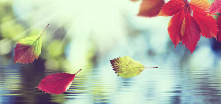 Colourful fall leaves in pond lake water, floating autumn leaf. Autumn wallpaper background concept of falling leaves on water surface. Beautiful reflection in water. Space for text.