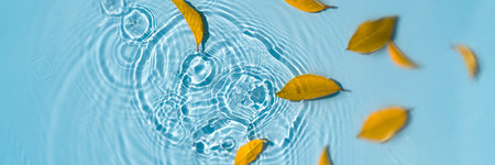 Abstract autumn background, falling leaves from yellow leaves on water with raindrops
