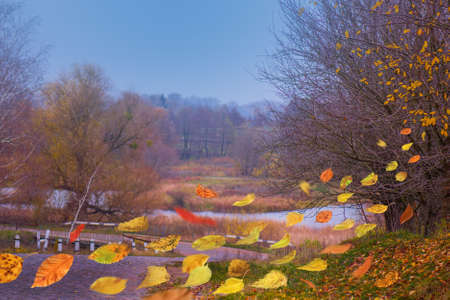 Wet fallen leaves on a wooden platform for fishing against the background of the river. high quality photo