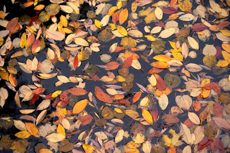Colorful autumn leaves floating on the water surface of a lake. Leaves floating in a pond of Quercus palustris, also called pin oak. Central Park in autumn, New York, USA.