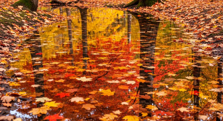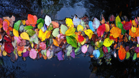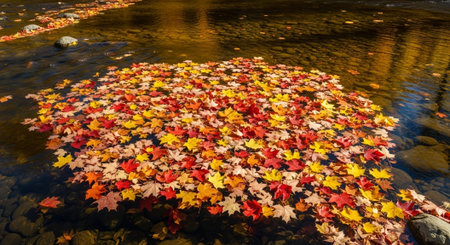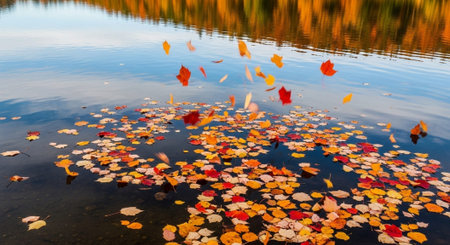 Autumn leaves float on calm water, creating a serene and colorful scene. The vibrant colors of fall are beautifully reflected.
