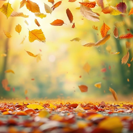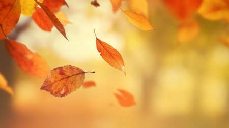 Falling autumn leaves in a park on a sunny afternoon. Warm, orange tones prevail. The serene image captures the beauty of the season.