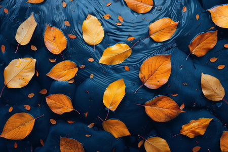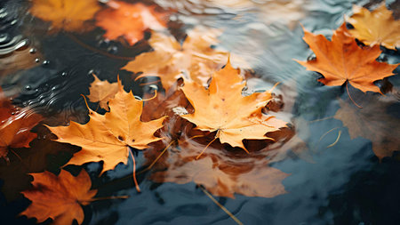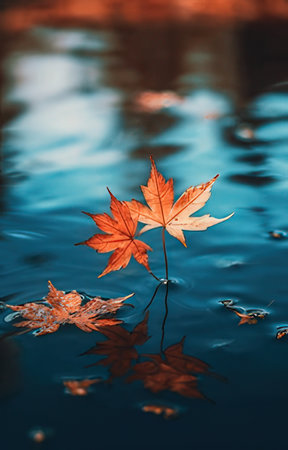 Orange autumn leaves gently float on a calm body of water, creating a serene and picturesque scene. The reflection enhances the tranquility.