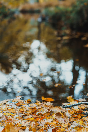 Autumn yellow fallen leaves floating on water. Forest river or pond with trees reflection. Fall seasonal background with copy space. Vertical card. selective focus.