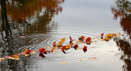 Autumn leaves gently float on calm water, creating a beautiful reflection and serene atmosphere.