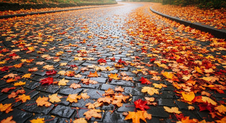 Autumn leaves on cobblestone road in the park. Fall background.