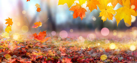 Falling maple leaves in city park natural autumn landscape
