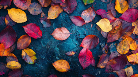 Colorful autumn leaves on dark blue textured background, top view