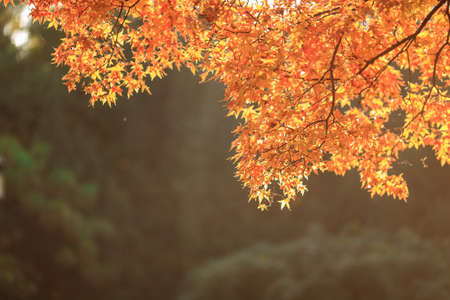 Beautiful maple leaves in autumn sunny day at foreground and blurry background in Taiwan, with no people, close up, copy space, macro shot.