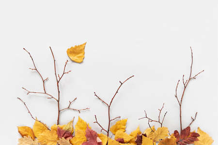 Group of colorful autumn leaves on branches on white background Autumn composition. Flat lay, copy space.