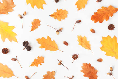 Autumn composition. Pattern made of autumn leaves, acorns, berries on white background. Flat lay, top view
