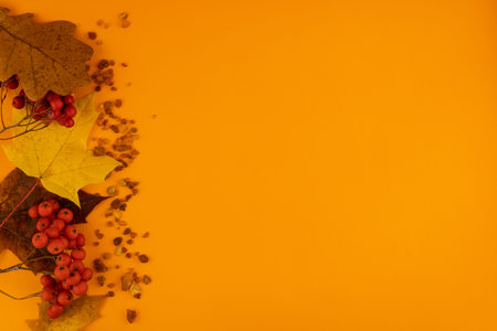 Collection beautiful colorful autumn leaves, cones, on oranges background. copy space.