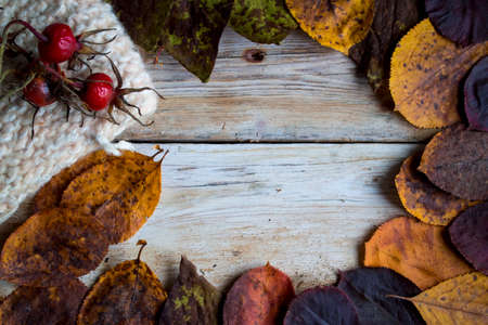 Fallen autumn leaves in the shape of a border, copy space for your text. Autumn background, a board with a wood texture and withered leaves of maple and other trees