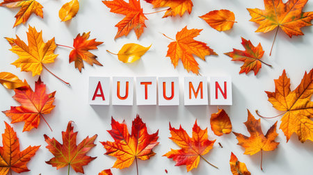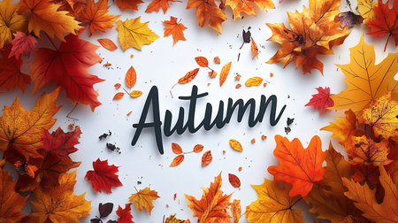 Beautiful autumn greeting card featuring colorful fall leaves arranged around the word 'AUTUMN' in bold letters. Perfect for seasonal themes, fall celebrations, and holiday greetings.