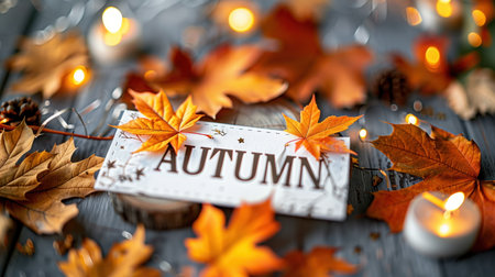 A beautifully designed autumn greeting card is surrounded by colorful fall leaves and warm candlelight on a rustic wooden surface. This image captures the cozy and inviting essence of the autumn season.