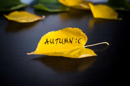 inscription autumn on the yellow fallen leaf on wooden background of autumn concept. Golden autumn.