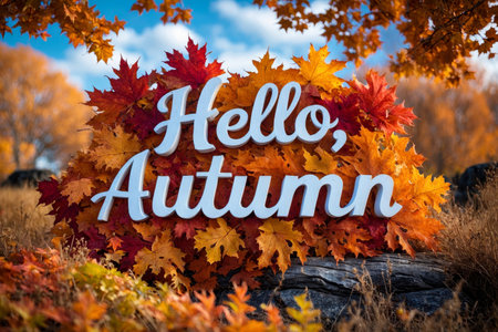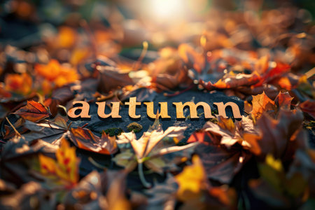 Beautiful autumn scenery featuring a greeting card with the word 'Autumn' surrounded by colorful fall leaves. Perfect for seasonal greeting cards, autumn-themed decorations, and nature-inspired artwork.