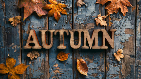 A close-up of the word AUTUMN spelled out in wooden letters against a backdrop of weathered blue wood planks. Scattered autumn leaves are visible around the letters.