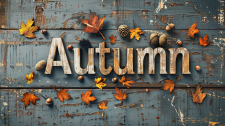 The word Autumn is spelled out in large, wooden letters on a weathered blue wooden background. The letters are surrounded by scattered autumn leaves and acorns.