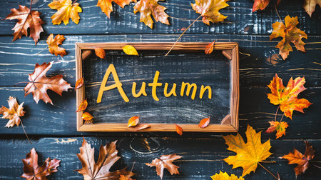 Autumn leaves and blackboard with autumn lettering on wooden background