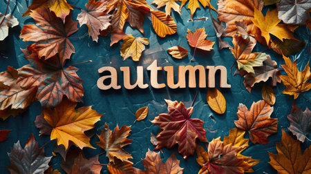 The word autumn is spelled out in orange wooden letters, lying on a rustic wooden surface. Scattered around the letters are fallen leaves of various shades of brown.