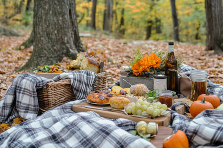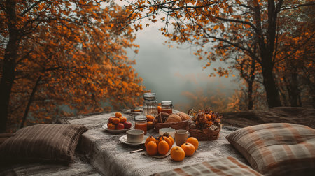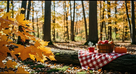 Embrace the enchanting allure of autumn with a cozy picnic amidst nature's splendor. This idyllic scene features a blanket adorned with delicious treats nestled beneath a canopy of vibrant fall