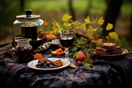 a table setup with mulled wine and figs for an autumn picnic, created with generative ai