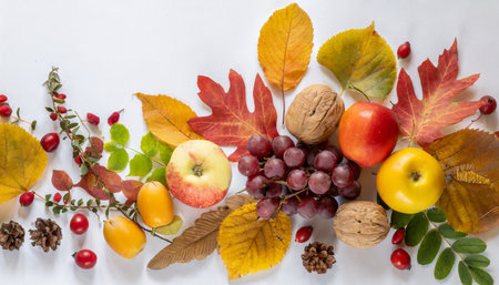 autumn leaves and autumn fruits on white background with copy space