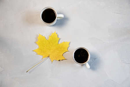 Two cups with coffee on white marble table. Photograph taken from above, top view with copy space. Maple leaf