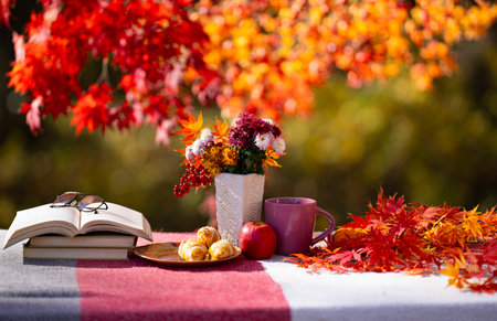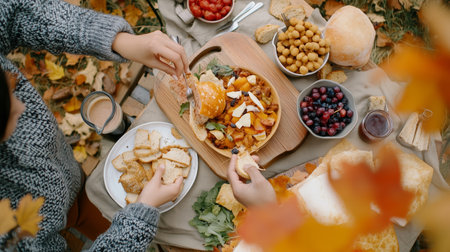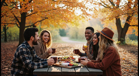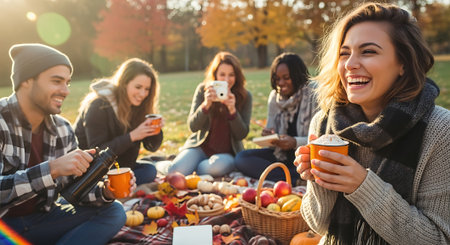 Enjoying a cozy autumn picnic with seasonal delicacies surrounded by colorful fall leaves