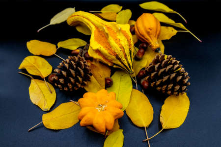 Ripe Pumpkins and the yellow autumn leaves on a black background. Harvest concept, Thanksgiving day