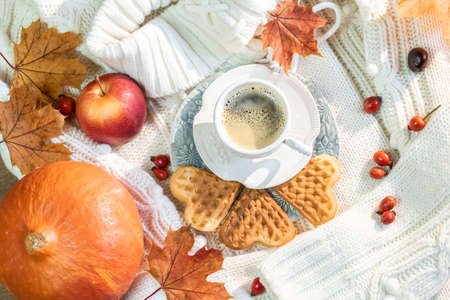 Autumn still life with a cup of coffee, autumn leaves, pumpkin. Evening time in the comfort of home.