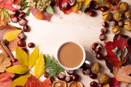 Autumn composition. Autumn layout on a light wooden background. Chestnuts, yellow dry leaves and a cup of coffee.