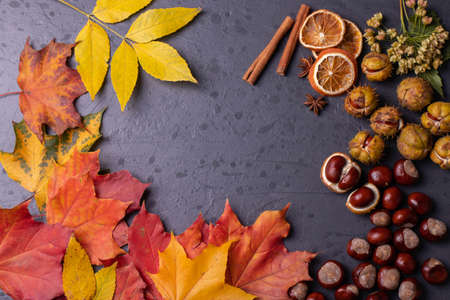 frame with text. with the description autumn, seasonal. Chalkboard and autumn leaves. natural background. empty space for text. close-up change of seasons.
