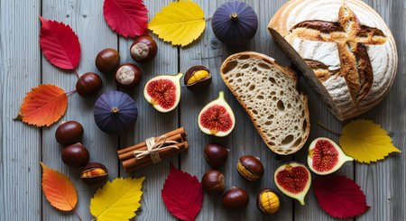 Autumn still life photography featuring figs chestnuts bread harvest feast display rustic wooden table surface fall season Thanksgiving concept food and ingredients.