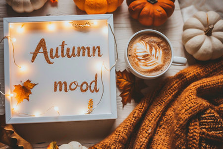 Autumn mood. A cup of coffee with a warm scarf, pumpkins and a sign with the inscription Autumn mood.