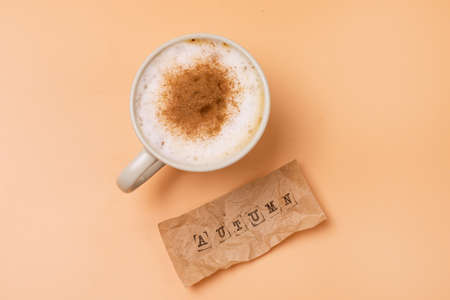 Autumn Concept or Background Cup of Coffee Capuccino Inscription Autumn is Made on Craft Paper Autumn is Coming