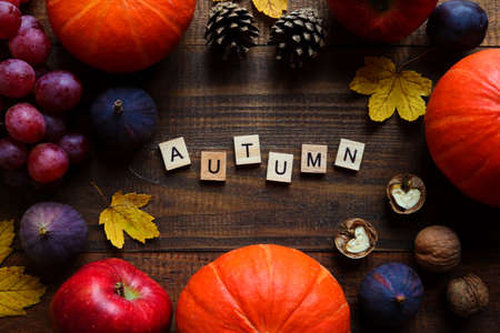 Autumn composition with seasonal products and inscription AUTUMN made from wooden letters.Pumpkins, grapes, figs, apples, pine cones, walnuts, and maple leaves.Autumn mood postcard.Top view, flat lay.